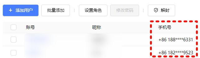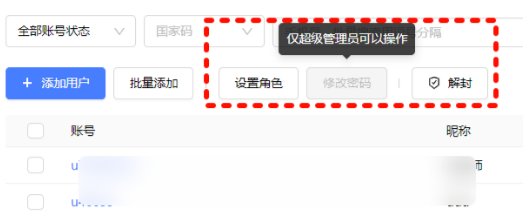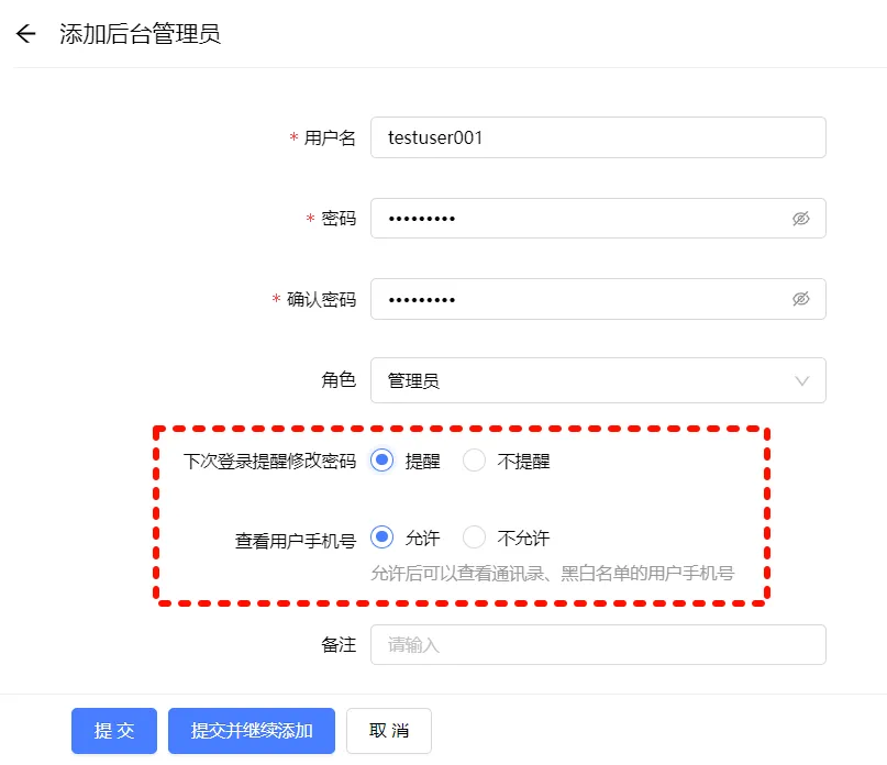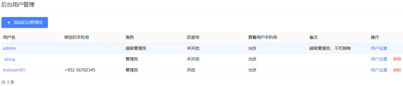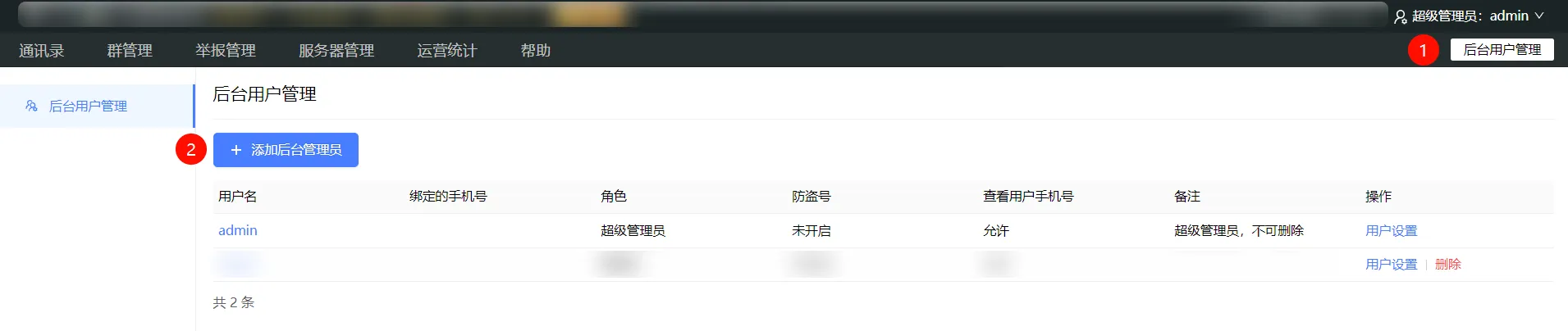 ## 管理后台管理员权限说明 根据角色差异,权限划分为以下两类 ● **超级管理员(admin):拥有全部管理权限**,具体包括: ① 查看所有管理员信息、配置账户属性、删除账户(自身除外)及创建子账号; ② 支持批量修改客户端账号的密码; ③ 限制普通管理员查看手机号的完整度(如 123****90); ④ 修改服务器消息保存时长; ⑤ 直接修改其他管理员的手机号、密码等账户核心信息(需验证超级管理员密码,无需验证绑定的手机号) ⑥可以查看所有管理员的可信登录记录 ⑦ 服务器有新版本发布时,超级管理员可以查看到新版本提示(红点)、预约服务器更新、取消预约 ● **普通管理员:部分功能受限,大多功能和超级管理员无区别**,具体包括: ① 仅限查看自身管理员设置,无法添加子账号; ② 仅限单独修改客户端账号密码(进入用户详情页修改),不支持批量修改; ③ 查看服务器消息保存时长的当前配置(无修改权限); ④ 查看手机号时受 admin 限制(默认显示隐藏后格式,无完整查看权限,除非 admin 授权); ⑤ 仅限查看自身管理员的登录记录    ## 后台管理员设置操作 ### (一)后台管理员设置页面 ① 使用超级管理员 admin 登录后,点击页面右上角【后台用户管理】按钮; ② 进入管理页面后,可查看以下信息: ○ 基础信息:用户名、手机号、备注; ○ 安全配置:是否开启防盗号(短信验证); ○ 权限配置:是否允许查看用户完整手机号。 ③ 页面右侧提供【设置】【删除】按钮,可对单个管理员执行操作(admin 不可删除)。   ### (二)添加后台管理员子账号 前置条件:仅超级管理员(admin)可执行此操作 1. 登录后台管理系统,进入【后台用户管理】页面; 2. 点击页面顶部【+ 添加后台管理员】按钮  3. 填写账户信息: ○ 必填项: ✅ 用户名(需确保唯一性) ✅ 密码(建议符合系统安全复杂度要求) ✅ 二次确认密码(需与密码一致) ○ 选填项: □ 下次登录提示修改密码 □ 允许查看用户完整手机号(未勾选则默认显示隐藏格式) 1. 提交表单: ○ 点击【提交】:创建完成后返回【后台用户管理】页面,可查看新增账号; ○ 点击【提交并继续添加】:保持当前页面,连续创建多个账号。