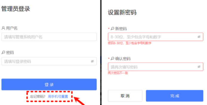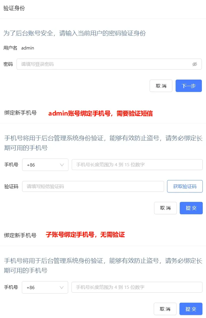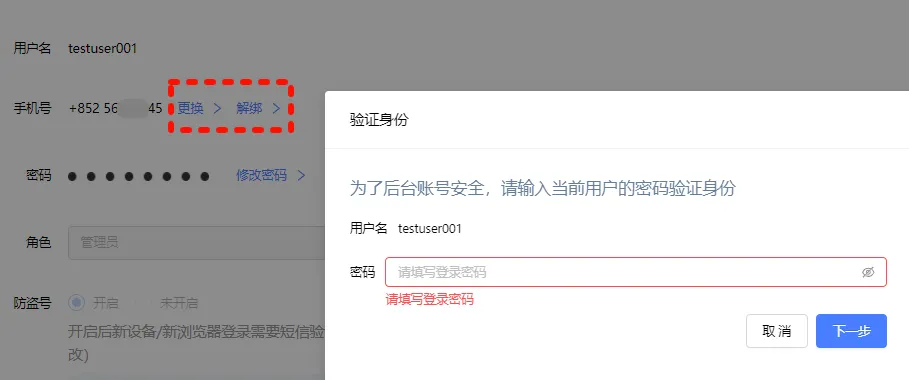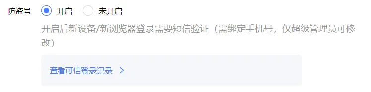 ### 1. 开启防盗号是什么效果 防盗号设置为核心安全机制,通过双重验证提升系统安全性。 开启防盗号后,在新电脑、新浏览器、或者浏览器清除缓存后,登录后台管理系统除了需要对应账号的密码,还需要绑定的手机号接收短信验证码。这样的双重验证可以保障权限极高的后台系统,提高服务器的安全性  开启防盗号后,即使管理员忘记账号密码,也可以通过绑定的手机号接收验证码进行【重置密码】。  无需开启防盗号设置,后台管理账号登录时,密码输错 5 次,会将账号锁定 1 小时。用户切换其他浏览器登录不会解除锁定状态,需要等待时间自动解锁,或通过短信验证码重置密码后自动解锁。  ### 2. 开启防盗号 1. 超级管理员 admin, 进入后台管理账号设置页面。  2. 进入需要开启防盗号的用户设置页,绑定手机号 ● 超级管理员给管理员配置手机号时,需要验证 admin 账号的密码 ● 绑定 admin 账号输入需要绑定的手机号码,接收验证码后完成绑定; ● 绑定账号不需要接收手机号验证码,输入手机号直接完成绑定  3. 防盗号设置,勾选开启  ### 3. 修改绑定的手机号 进入用户设置页 ● 超级管理员可以直接修改子账号的手机号,无需子账号的许可和手机号验证 ● 当前子账号需要先输入账号密码验证身份;再输入手机号+短信验证码验证后换绑
